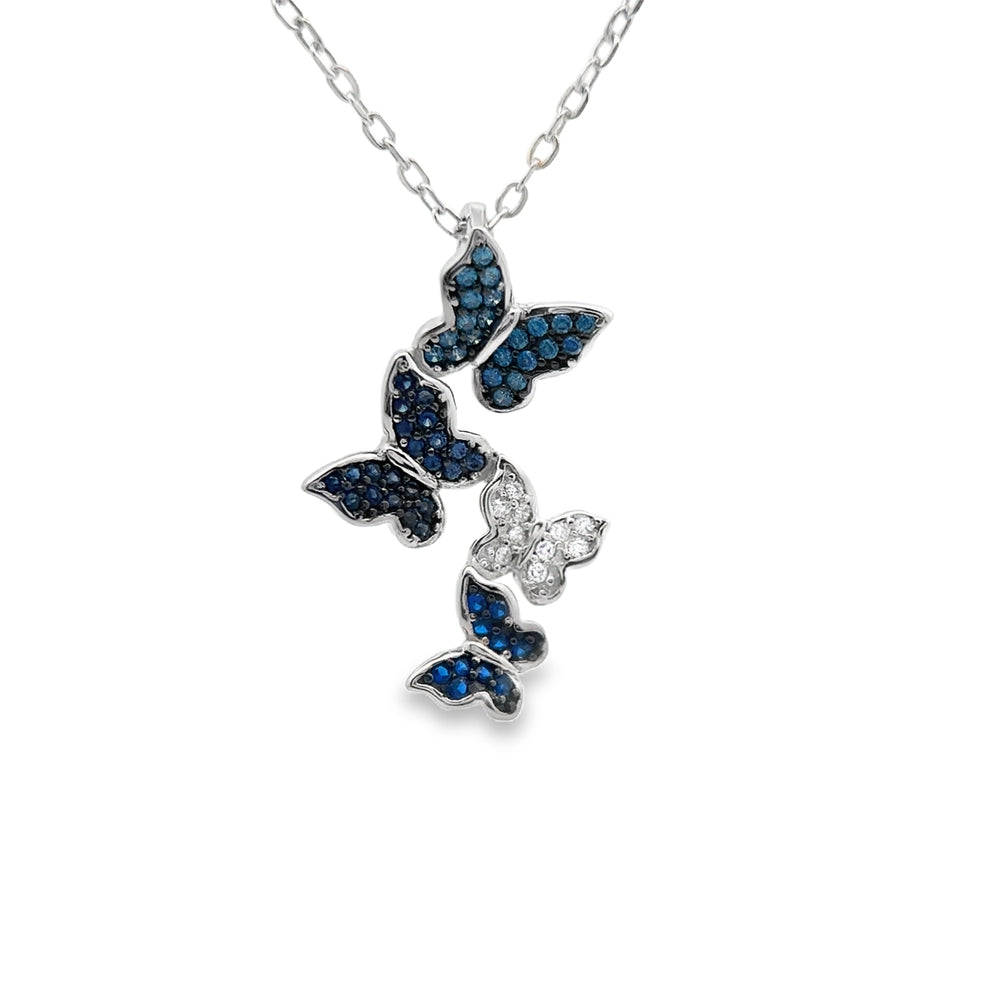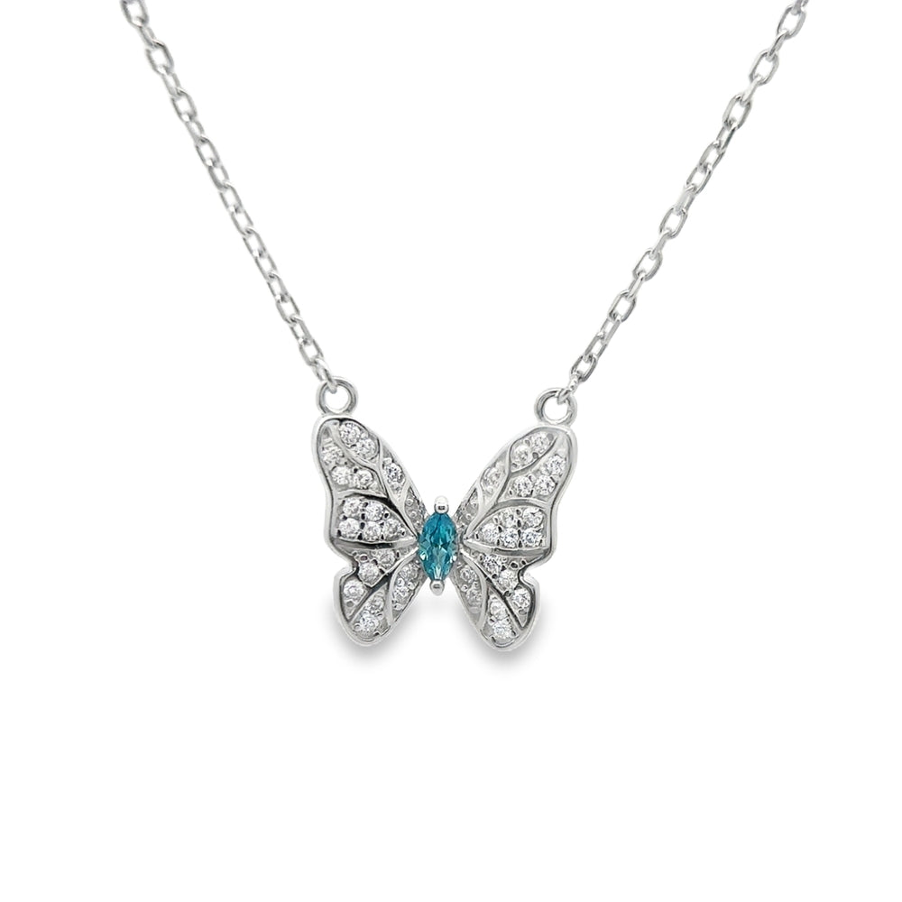 N5279 SILVER 16IN+2IN CHAIN 4MM BLUE WHT FULLCZ 12MM BUTTERLY PENDANT 2.9G