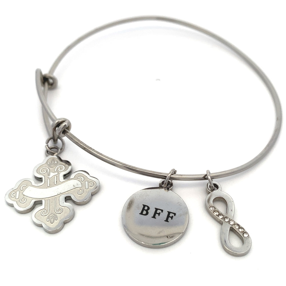Cross, Infinity & Round Stainless Steel Charm Bangle